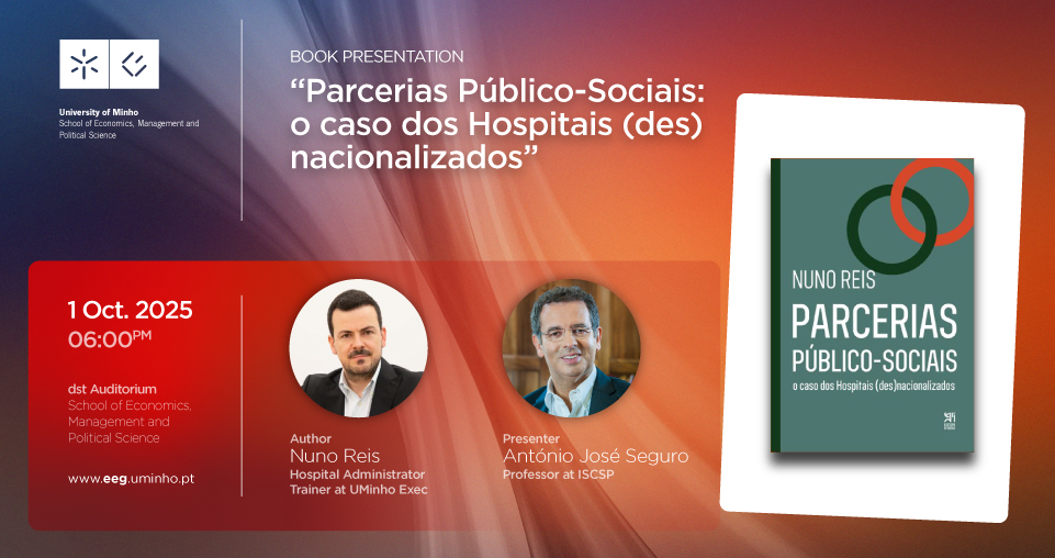 The School of Economics, Management and Political Science of the University of Minho invites the entire academic community to participate in the presentation of the book Public-Social Partnerships: the case of (de)nationalised hospitals, by Nuno Reis, to be held on 1 October 2025, at 6:00 p.m., in the dst Auditorium of the EEG.