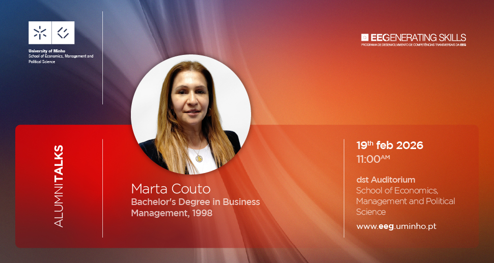 The School of Economics, Management, and Political Science at the University of Minho invites students to participate in the AlumniTalks@EEG session, which will take place on February 19, 2026, at 11:00 a.m., in the dst Auditorium.