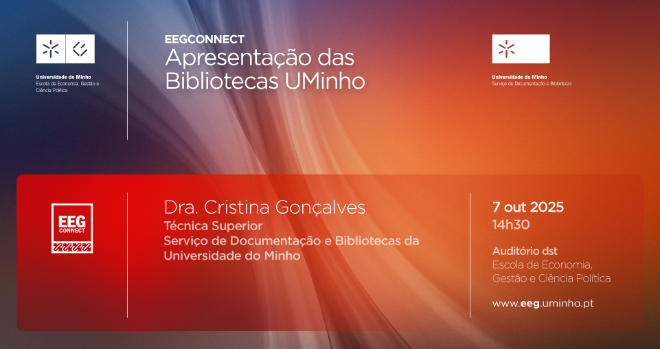 A Escola de Economia, Gestão e Ciência Política da Universidade do Minho convida toda a comunidade académica, em especial os estudantes do 1.º ano do 1.º ciclo e todos os que ainda não estejam familiarizados com os recursos das bibliotecas da Universidade do Minho, a participar na sessão “EEGConnect: Apresentação das Bibliotecas UMinho”, que terá lugar no próximo dia 7 de outubro, pelas 14h30, no Auditório dst da EEG.